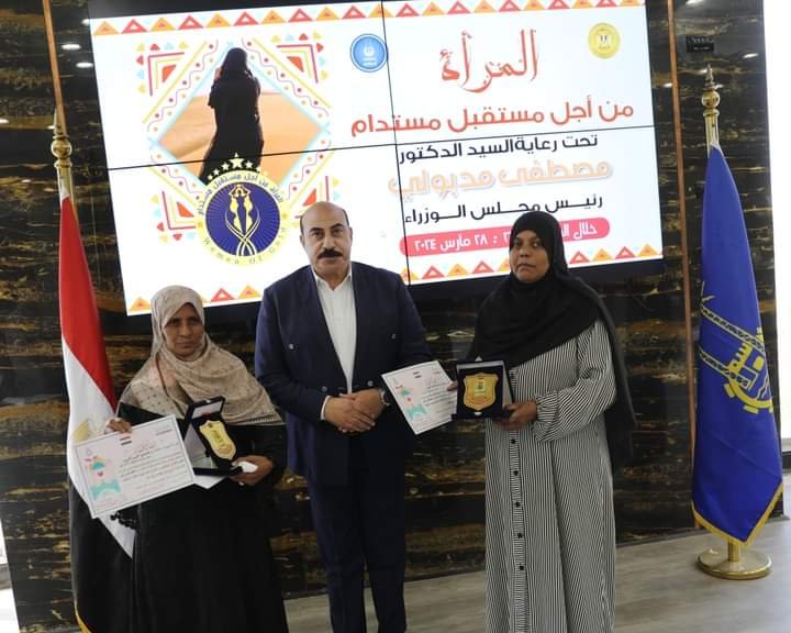 المشروعات الخضراء الذكية لرائدات الأعمال ويتمثل فى تسريع وتيرة تصميم المشروعات الخضراء الذكية حيث تم شارك المشروع ضمن مؤتمر كوب ٢٨ بدولة الإمارات الشقيقة وأوضح أشرف عطية على أننا نسعد دائماً بالنجاحات المتتالية التى تحققها المرأة الأسوانية ونحرص على تمكينها ودعمها بشكل مستمر حيث يتم تسخير كافة الإمكانيات لمشاركة أصحاب المواهب من السيدات فى المعارض المحلية والدولية للمشغولات والحرف التراثية واليدوية لافتاً إلى أن الهدف من إحتفالية المرأة من أجل مستقبل مستدام هو هدف توعوى للتأكيد على الجهود المبذولة لتمكين المرأة من خلال مشاركتها فى الدورات التدريبة التى تؤهلها لتقود مسيرة العمل والإنتاج فى مختلف المؤسسات الحكومية والمجتمعية وفى نهاية اللقاء قام محافظ أسوان بإهداء شهادات تقدير ودرع المحافظة ومكافأة مالية لسيدتين بالديوان العام .