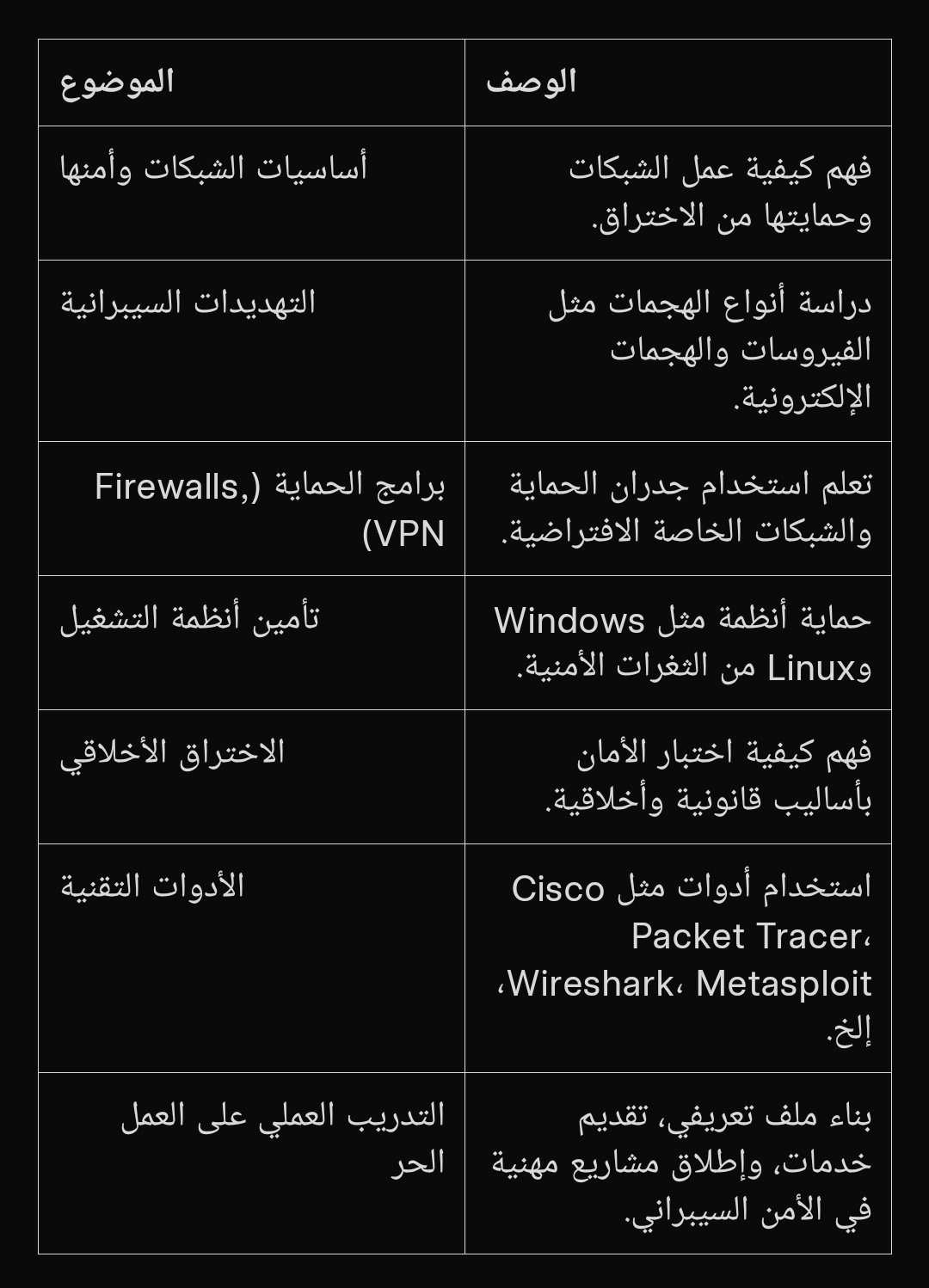 – يشمل التدريب موضوعات مثل أساسيات الشبكات، التهديدات السيبرانية، والأدوات مثل Cisco Packet Tracer و Wireshark، بالإضافة إلى تدريب عملي على العمل الحر.