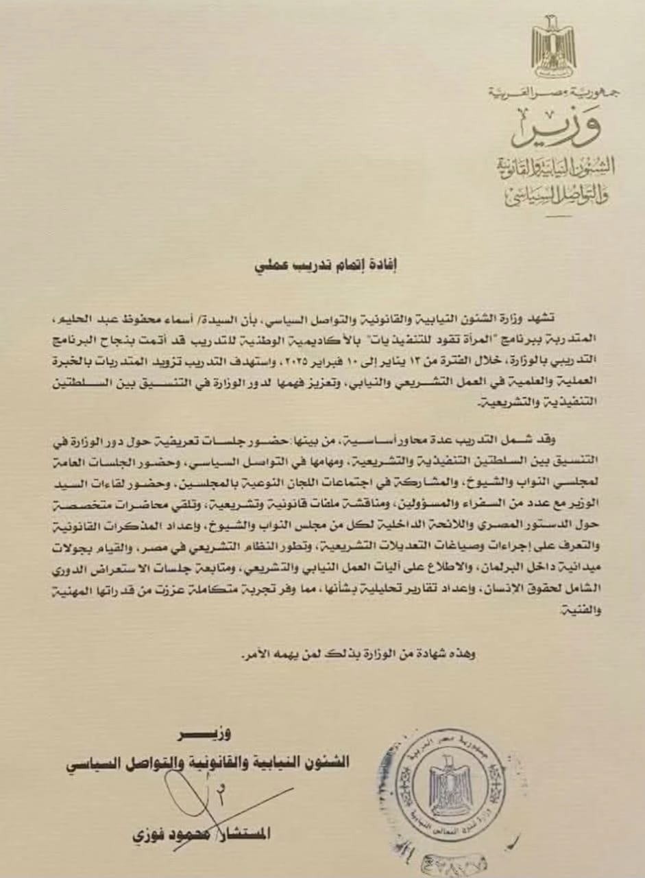وجاء في الإفادة، أن أسماء محفوظ عبدالحليم، كانت متدربه ضمن برنامج ” المرأة تقود للتنفيذيات” بالأكاديمية الوطنية للتدريب، حيث أتمت بنجاح البرنامج التدريبي بالوزارة خلال الفترة من 12 يناير وحتى 10 أبريل 2025″.