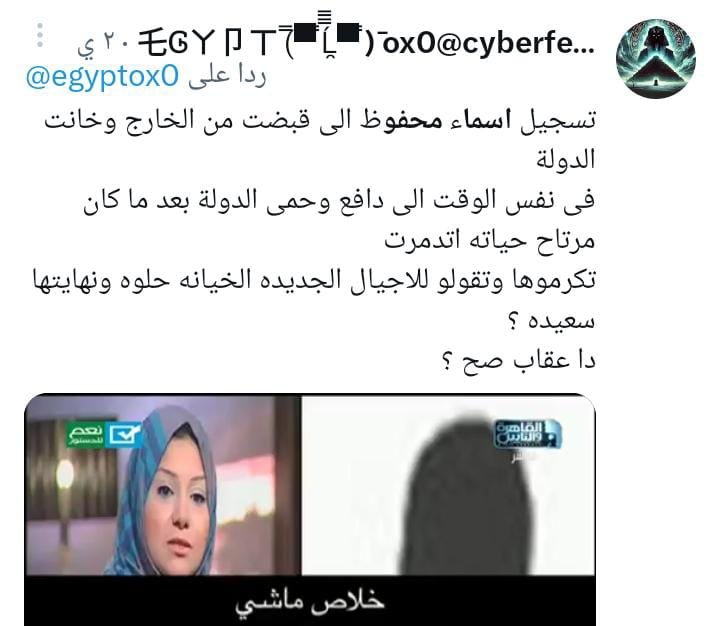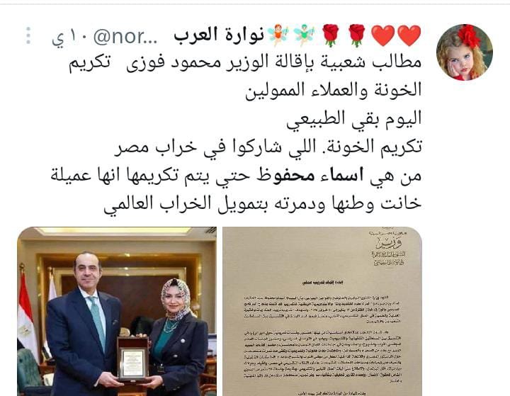 تابعت أخرى على منصة إكس: لما وزير يكرم اسماء محفوظ يبقى احنا فعلا شعب مغفل واتلعب بينا لمصلحتهم ولا زالوا بيلعبوا بينا.