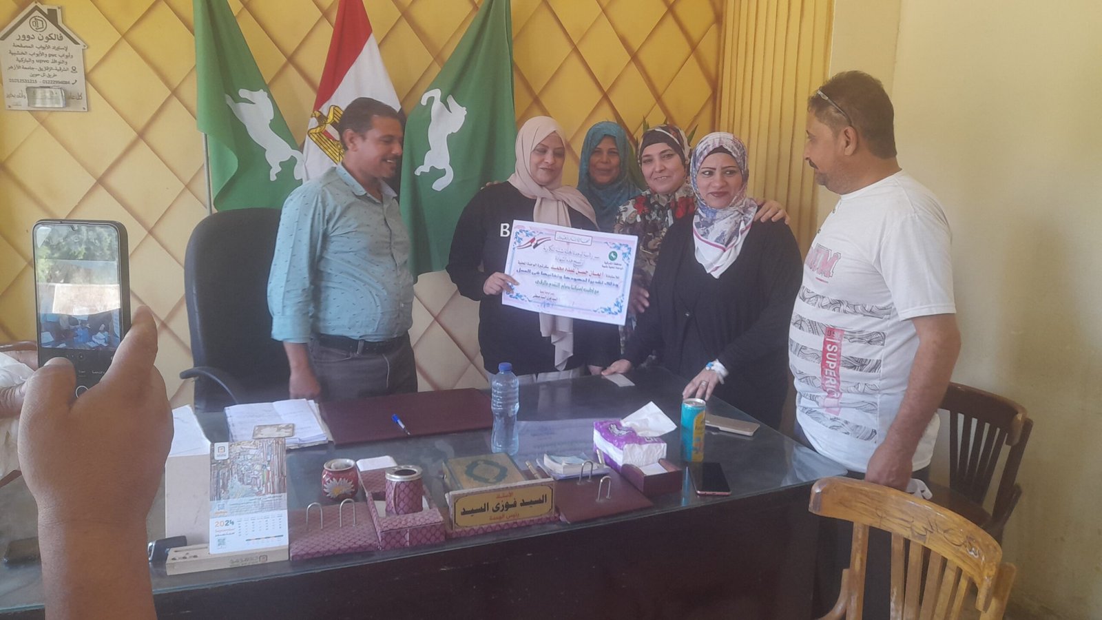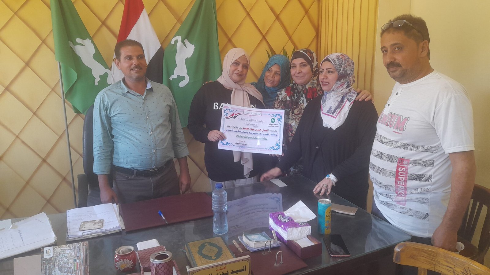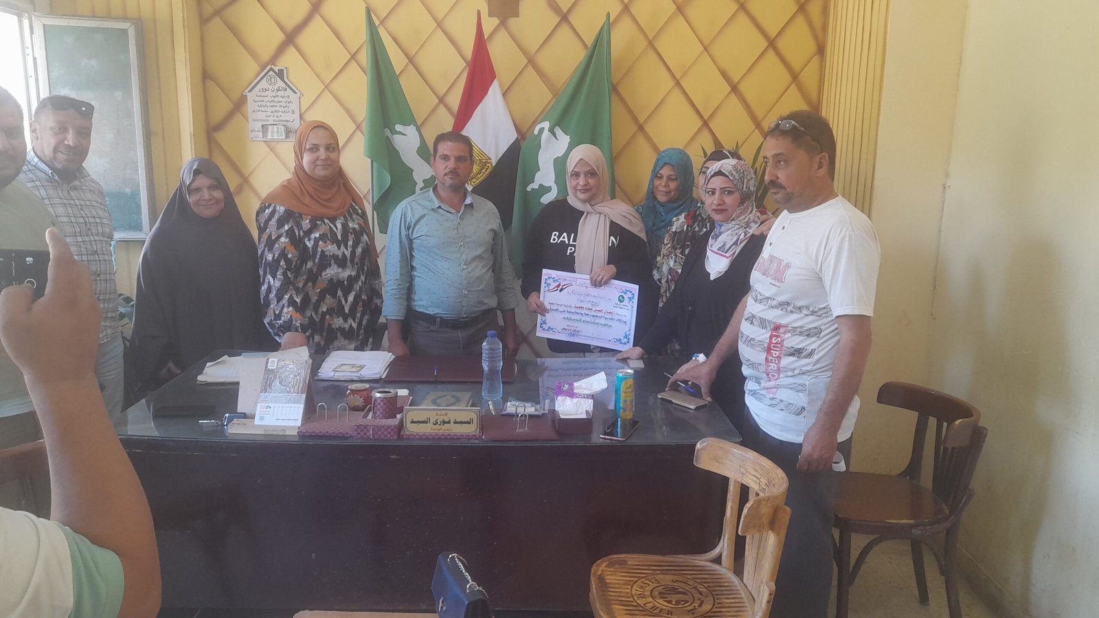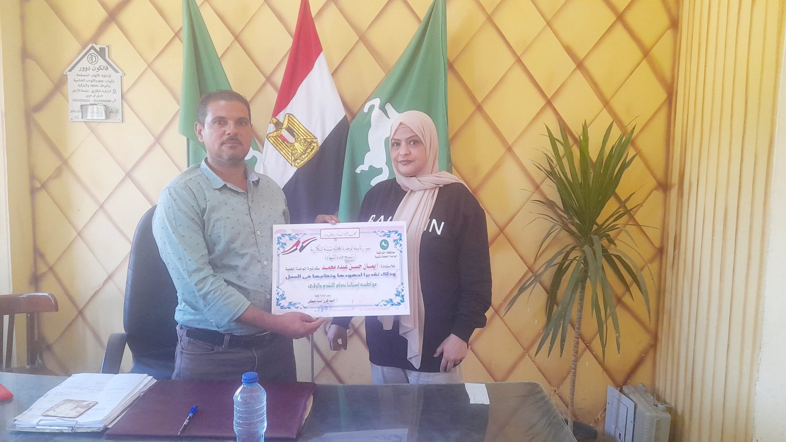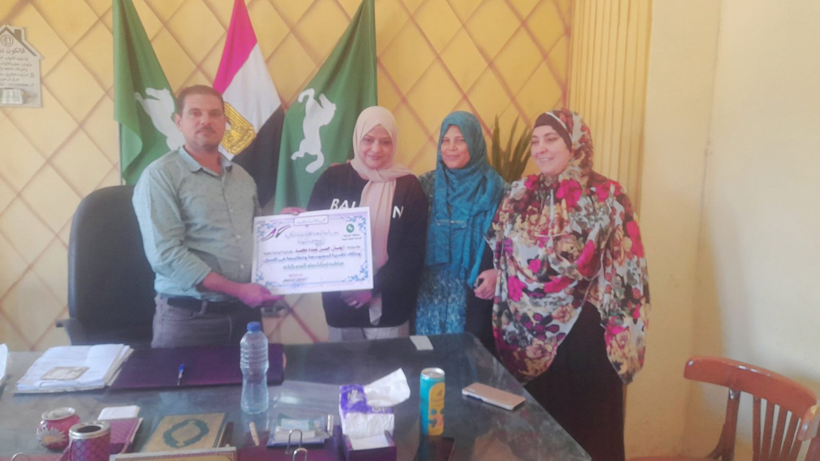 الأستاذة إيمان حسن بحضور المهندس أحمدالعرينى والأستاذ خالد النجار والأستاذة فاطمه وذلك بحضور الأستاذ السيد فوزي السيد رئيس الوحدة المحلية بشيبة النكارية وفريق العمل بالوحدة والساده الزملاء وذلك تقديرا لجهودها وللأداء المتميز وحسن معاملة المواطنين والمترددين على الوحدة المحلية.
