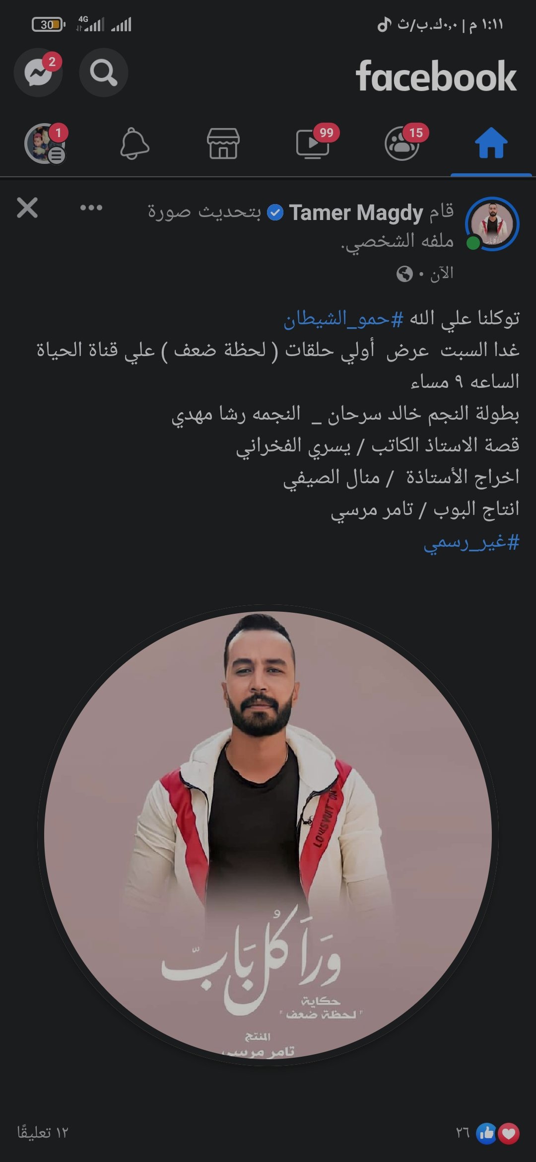 نشر الفنان تامر مجدي صورة له ترويجًا لحكاية”لحظة ضعف” من مسلسل”ورا كل باب حكاية”، على حسابه الرسمي على موقع التواصل الإجتماعي الشهير”فيسبوك”.