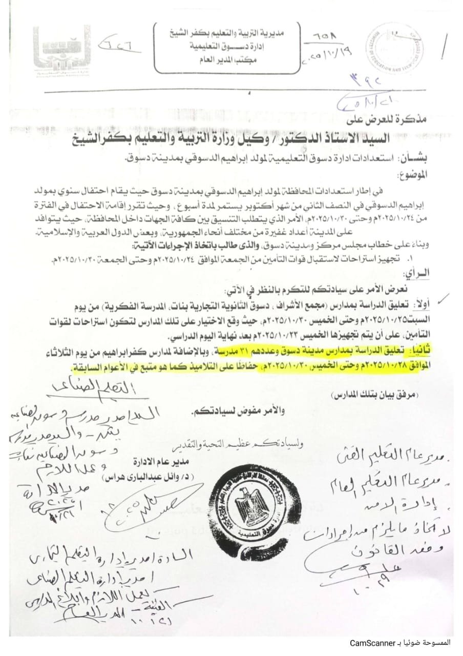 كما يتم إرجاء الامتحانات بمدارس مدينة دسوق فقط و مدرستى كفر ابراهيم الاعداديه وكفر ابراهيم الابتدائيه. للإسبوع بعد القادم ابتداءا من يوم الأحد 2/11/2025 بنفس ترتيب. الجدول المعلن من قبل وذلك حرصا على ارتفاع نسب الحضور . وذلك بسبب امتداد مظاهر الاحتفالات بمعظم شوارع المدينه. على أن يكون السبت والاحد والاثنين من الاسبوع القادم ايام حضور عاديه لمدارس الفترتين. وايام الاحد والاثنين ايام حضور عاديه لمدارس الفتره الواحده. على أن تعلق الدراسه ابتداءا من الثلاثاء 28/10/2025 وحتى الخميس 30/10/2025 وفقا لقرار معالى الوزير المحافظ.