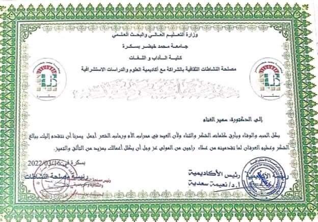 قد نظمت أكاديمية العلوم والدراسات الاستشرافية ومصلحة النشاطات الثقافية والعلمية والرياضية في كلية الآداب واللغات بجامعة بسكرة..رئاسة البروفيسور نعيمة سعدية من جامعة بسكرة _الجزائر، وقد شارك في الندوة الاحتفائية باحثات ومبدعات أمهات في كل المجالات من كل الأقطار العربية شامخات،منهن: الدكتورة سهير الغنام الإمارات العربية المتحدة، ود.لؤلؤة ال خليفة جامعة البحرين، أ.د رائدة العامري جامعة بابل العراق، د.امينة هيدريز من جامعة صبراتة ليبيا، أ.د شادية شقروش المملكة العربية السعودية، ود.درية فرحات من لبنان، و.د زينب لوت المدرسة العليا للأساتذة مستغانم ، د.وسام الخالدي العراق ، ود.فاطمة بن محمود من تونس، أ.د سعاد بسناسي جامعة وهران، أ.د أمينة،و أ.د آمنة بلعلى وأ.د راوية يحياوي وا.د ذهبية حمو الحاج من تيزيوزو، و أ.د دليلة مزوز، أ.د رحيمة شيتر ، د.زودة فطيمة من جامعة باتنة، د.لطيفة هباشي ، أ.د عائشة رماش عنابة، أ.د فاطمة الزهراء بايزيد جامعة بسكرة، عائشة بنور، العاصمة، د.نادية كوكباني من اليمن، د.ناصرية فيلالي، من المملكة المتحدة لندن، تميز الندوة بقراءة مقاطع شعرية من الشاعرتين فاكية صباحي ولطيفة حرباوي من بسكرة، وتكريمهما مع تكريم من يمثل الموظفة الأم وهما موظفتان سهام وصباح، وتكريم من بمثل الأم الطالبة في طور الدكتوراة، وتكريم أستذات أمهات من كلية الآداب واللغات من قسم الفرنسية والإنجليزية بحضور السيد عميد كلية الآداب واللغات ونائبته المكلف بالبيداغوجيا ، السيدة رئس قسم الاداب واللغة الأجنبية..
