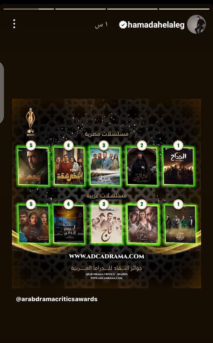 كما نشر أيضًا حالة من خلال حسابه على الإنستجرام بحصول مسلسل المداح على المركز الأول وذلك من جوائز النقاد للدراما العربية.