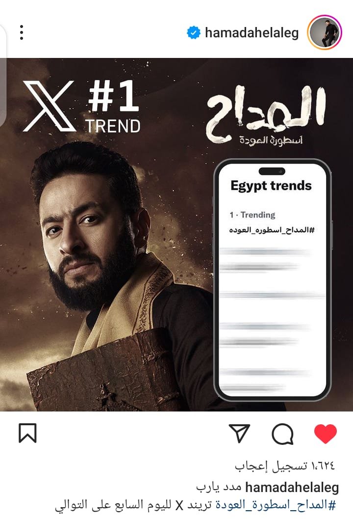 حيث علق عليها قائلاً: “مدد يارب.. #المداح_إسطورة العودة تريند X لليوم السابع على التوالي”.