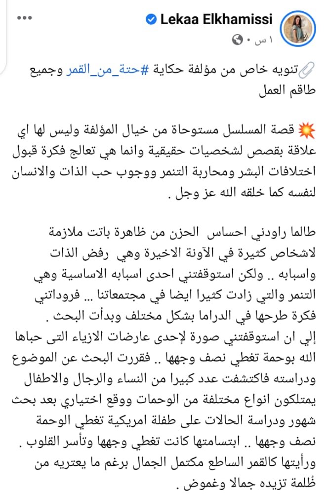نشرت الفنانة لقاء الخميسى بوست عبر موقعها على الفيس بوك وأيضاً الانستجرام توضح فيه أن دور قمر التي تقوم بتجسيده في مسلسل حتة من القمر ليس له علاقة بشخصيات حقيقة أو أنه قصة واقعية وأنه من وحي خيال المؤلفة .
