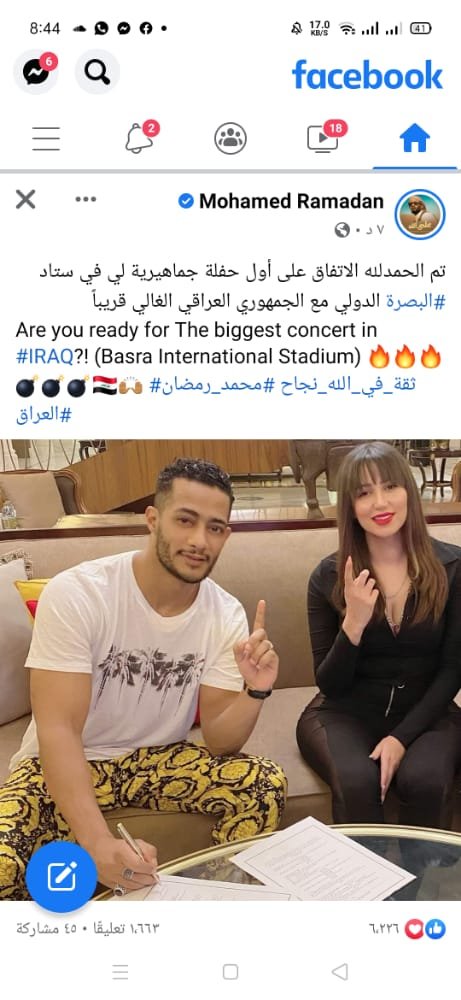 معلقًا عليها :” تم الحمدلله الإتفاق على أول حفلة جماهيرية لي في ستاد، البصرة الدولي مع الجمهور العراقي الغالي قريبًا، Are you ready for the biggest concert in IRAQ?! “.