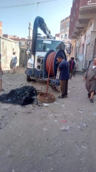 حيث تم تطهير بلاعات الصرف الرئيسيه بهذه المناطق بواسطة سيارات التطهير الديناميكي