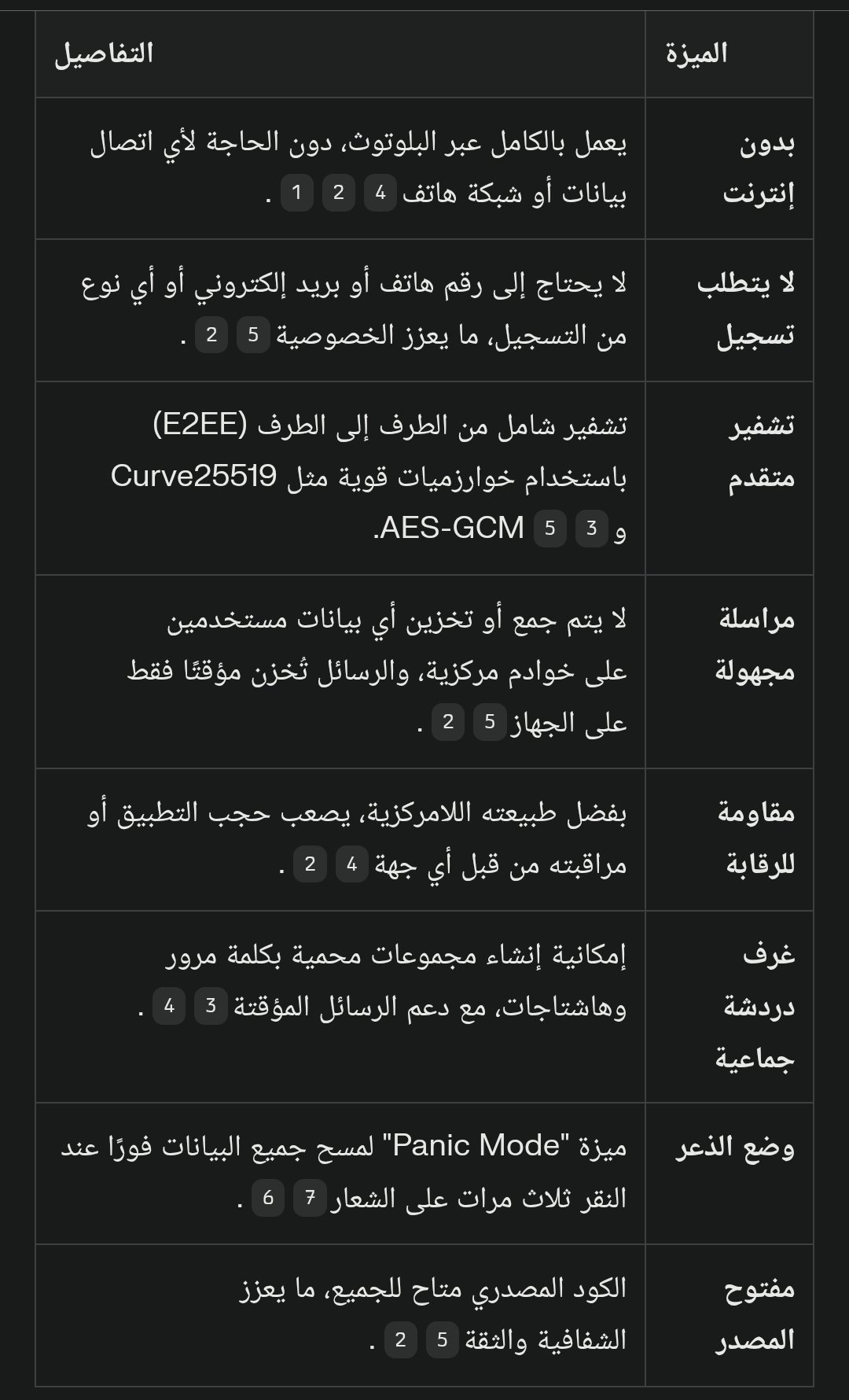 الرسائل لا تمر عبر أي خوادم، بل تنتقل مباشرة بين الأجهزة، ما يجعل من شبه المستحيل اعتراضها أو مراقبتها.